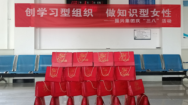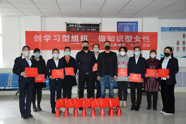 在慶祝三八婦女節(jié)儀式上,集團公司副董事長鄭龍和副總經(jīng)理蘭小偉為全體女職工發(fā)放了福利并合影。